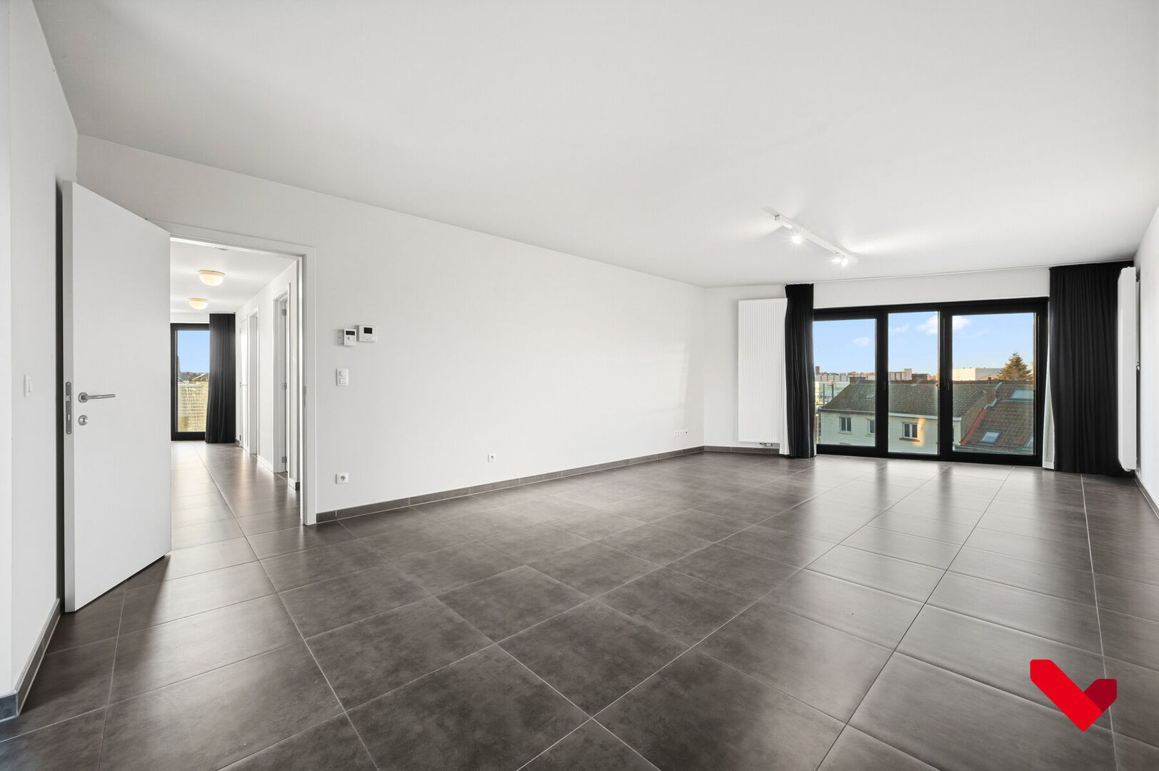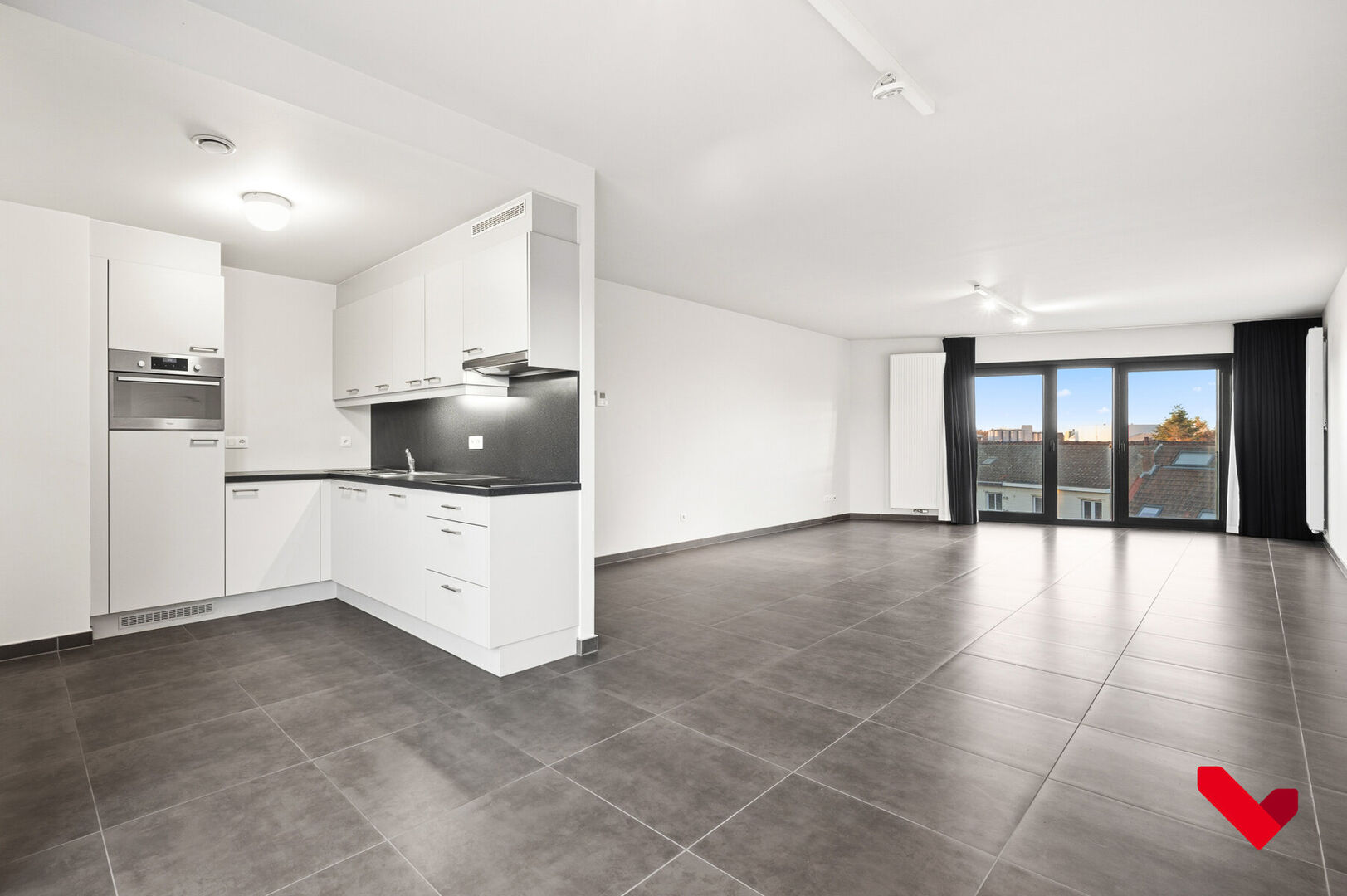 Newly built apartment in Residence Belle-Vue, located just behind Leuven station. The two-bedroom apartment is located on the top floor and has a beautiful view. Thanks to its excellent location, the apartment is an ideal base for people who want to use public transport, but also for those who prefer to travel by car, as it is close to the E314 motorway entrance and exit. Layout: Newly built apartment in Residence Belle-Vue, located just behind Leuven station. The two-bedroom apartment is located on the top floor and has a beautiful view. Thanks to its excellent location, the apartment is an ideal base for people who want to use public transport, but also for those who prefer to travel by car, as it is close to the E314 motorway entrance and exit. Layout: You enter the apartment through the entrance hall, which connects the living and sleeping areas, and leads to the living and dining room. This very spacious living and dining room has plenty of natural light and offers extremely pleasant views of Leuven at the front. Behind the dining area is a terrace where you can relax in the summer and enjoy views of Kessel-lo. Next to this is the open-plan, fully equipped, sleek kitchen, which is very comfortable. The other side of the apartment comprises two bedrooms and a pleasant bathroom with a sink and shower.