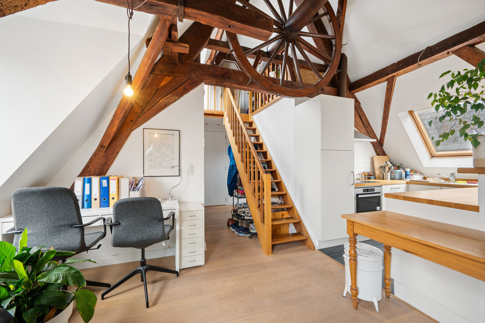 The apartment comprises an entrance hall, a small room, a bathroom with shower-in-bath, and a spacious open-plan living area with high exposed beams and an open kitchen. Under the attractive gabled roof is another cozy room, ideal as a bedroom.