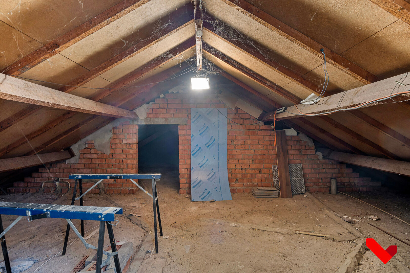 La maison est aménagée de manière pratique. Le rez-de-chaussée comprend un hall d'entrée, un espace de vie et une cuisine. En outre, il y a une salle de bains, deux chambres spacieuses et une pièce plus petite, idéale comme bureau, dressing ou pièce de rangement supplémentaire. L'étage mansardé abrite déjà une chambre et offre d'autres possibilités d'agrandissement.