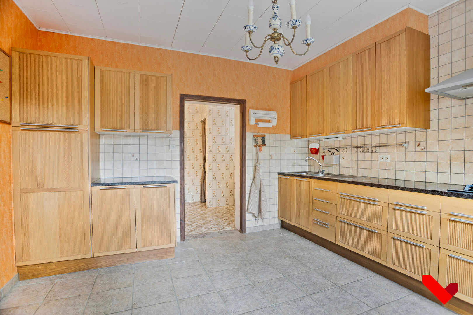 Sur la droite du couloir, vous trouverez une cuisine spacieuse et robuste avec de nombreuses possibilités de rangement, suivie de la salle de bains, équipée d’une baignoire, d’un lavabo et de toilettes. L’ensemble est fonctionnel et bien entretenu. La maison dispose également d’une petite cave sèche, idéale pour le stockage ou comme réserve.
