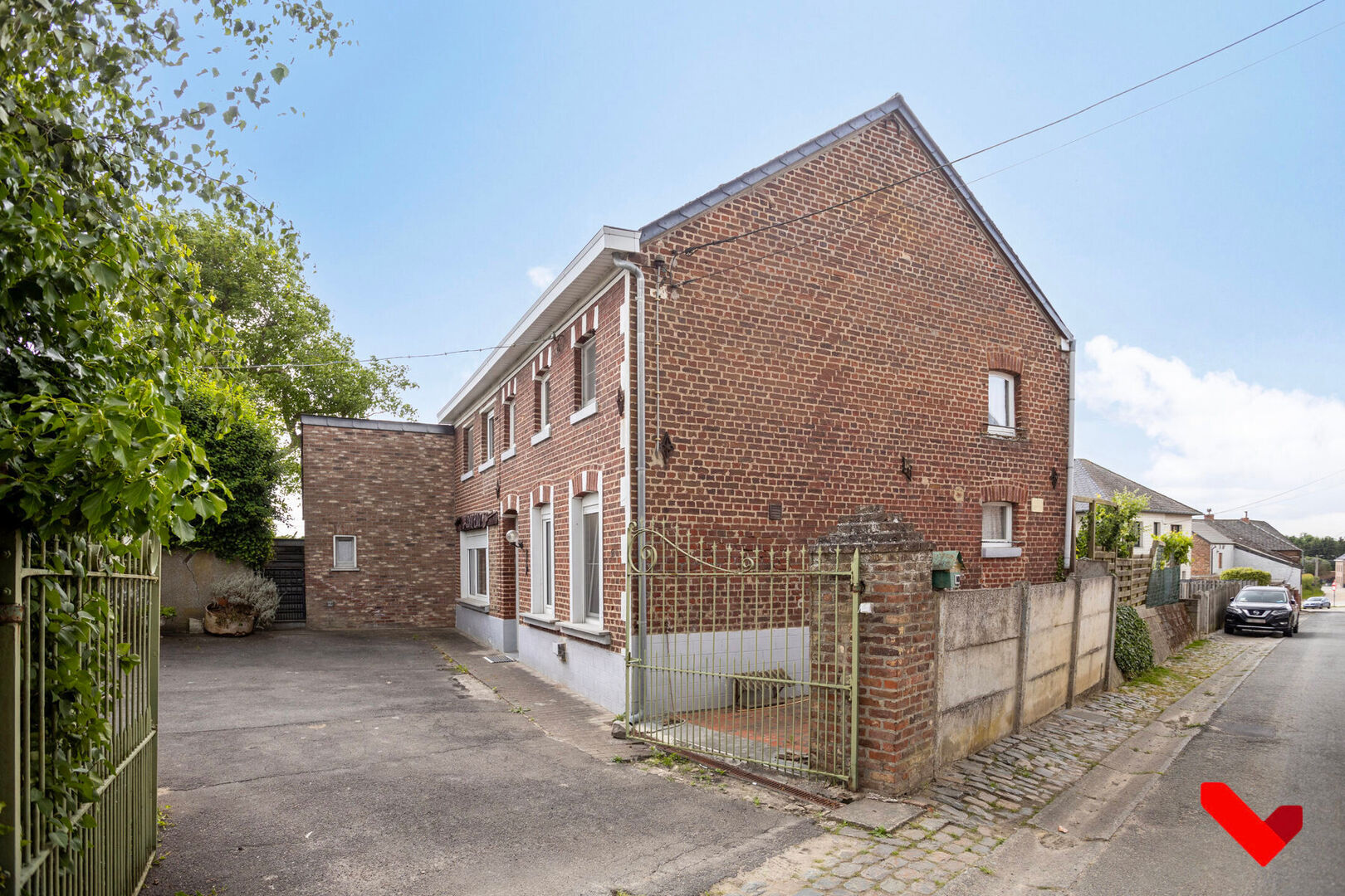 À l’avant de la maison, autour de la cour, se trouvent un double garage et une annexe. Ces espaces offrent de nombreuses possibilités : atelier, espace de loisirs, rangement ou lieu de travail. L’allée spacieuse permet également un stationnement supplémentaire.