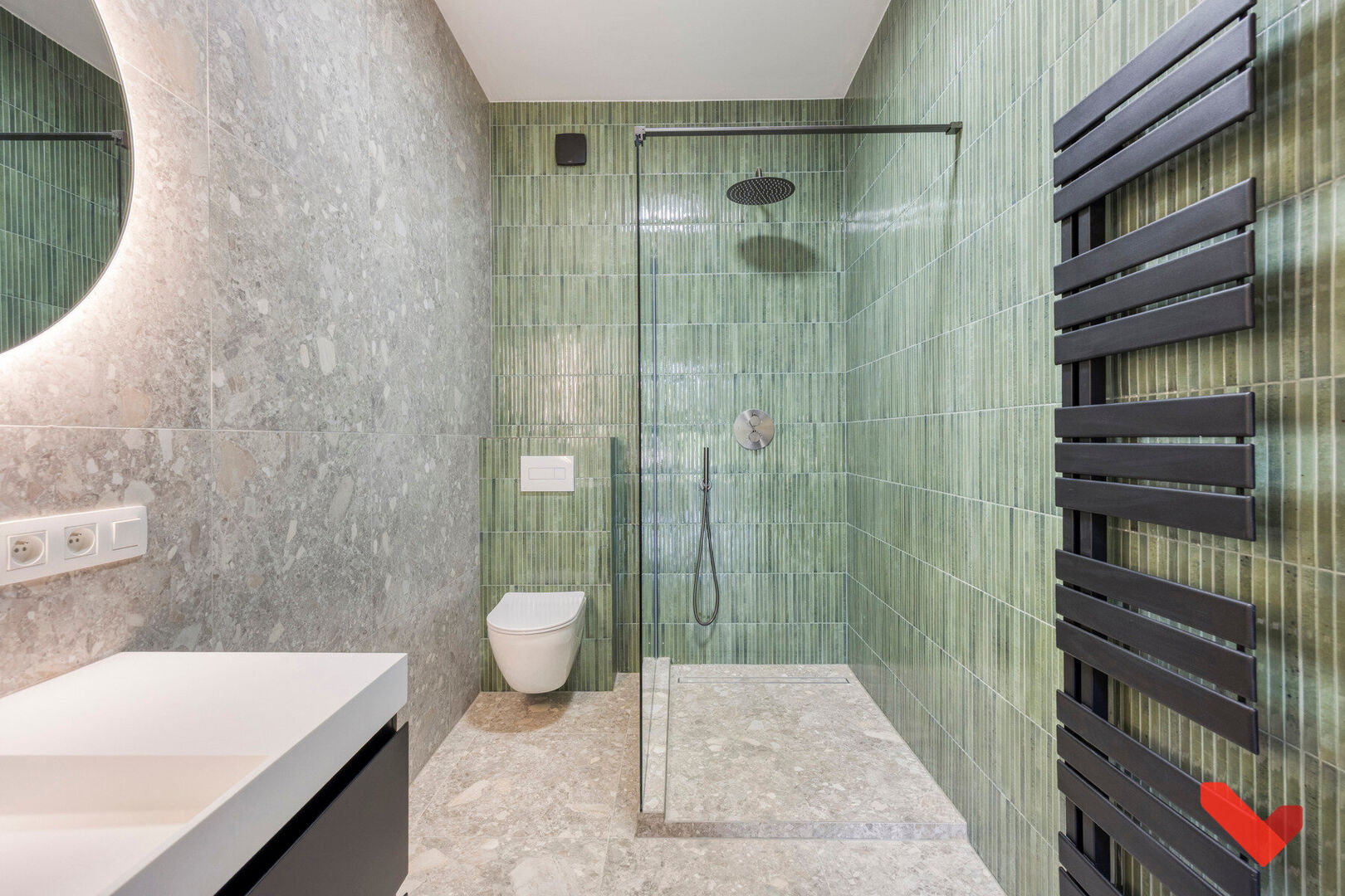 Au rez-de-chaussée, se trouvent un espace de vie ouvert baigné de lumière naturelle, des toilettes pour invités, ainsi qu’une cuisine entièrement neuve au design épuré, équipée d’appareils de qualité et offrant beaucoup de rangement. Le chauffage au sol assure un confort agréable, tandis qu’une grande porte coulissante relie le séjour à la terrasse et au jardin.