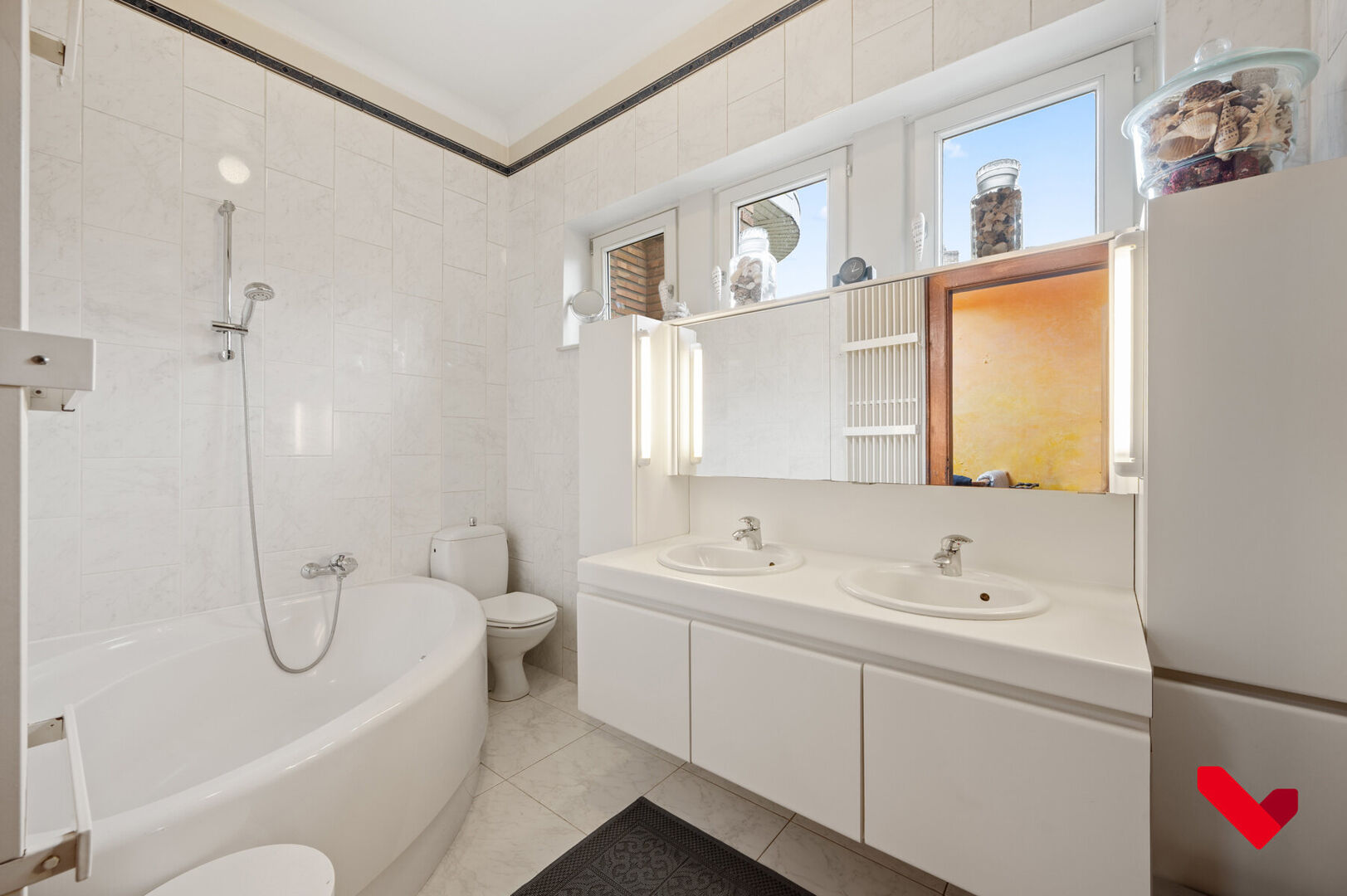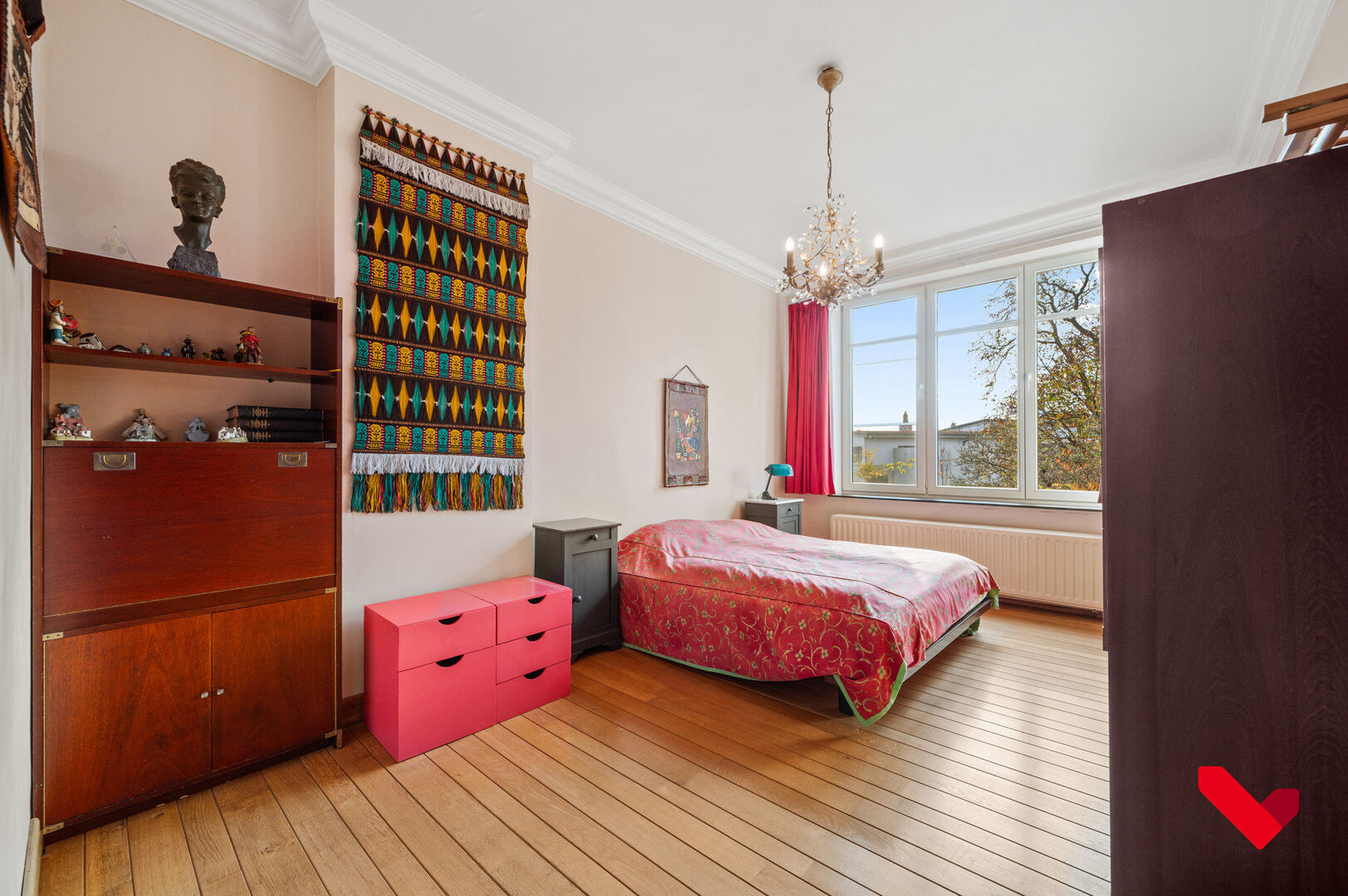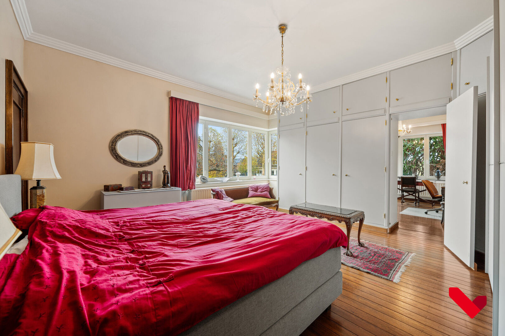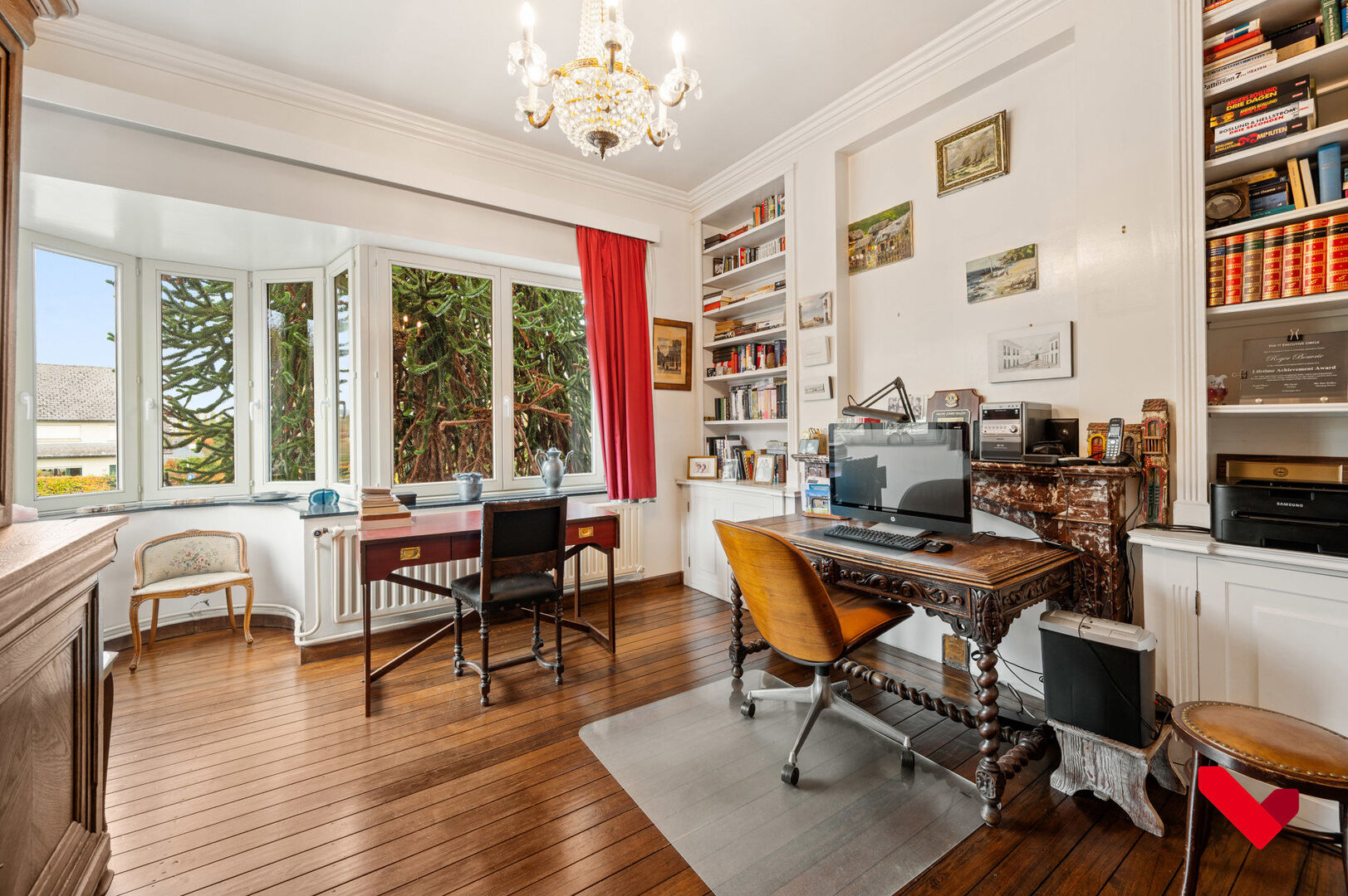 Le hall d’entrée constitue le centre majestueux de la maison et en répartit harmonieusement les espaces. D’un côté se trouve le vaste séjour plein de caractère, avec parquet, grandes fenêtres et finitions classiques qui renforcent le charme de la maison. De l’autre côté, vous trouverez la grande cuisine avec vue sur le jardin ainsi qu’un second espace de vie, idéal comme salon supplémentaire, bureau ou pièce polyvalente. Chaque pièce possède son propre caractère et sa fonctionnalité, tout en s’intégrant parfaitement dans l’ensemble élégant de la maison.