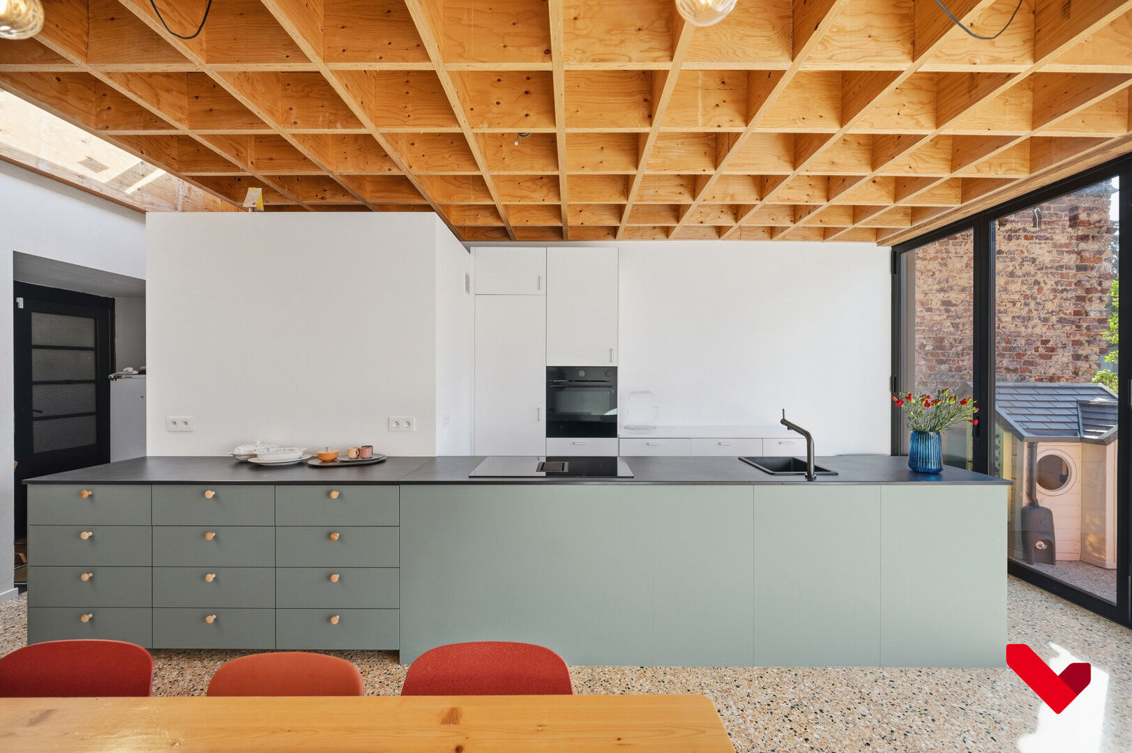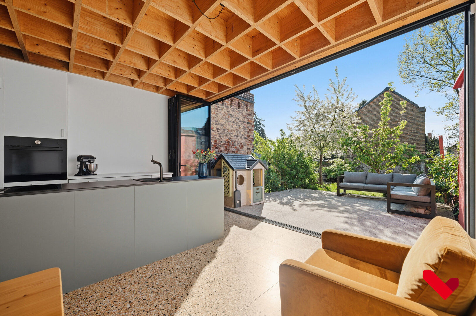 • Accès au jardin par une grande baie vitrée à soufflet s'ouvrant sur toute la largeur