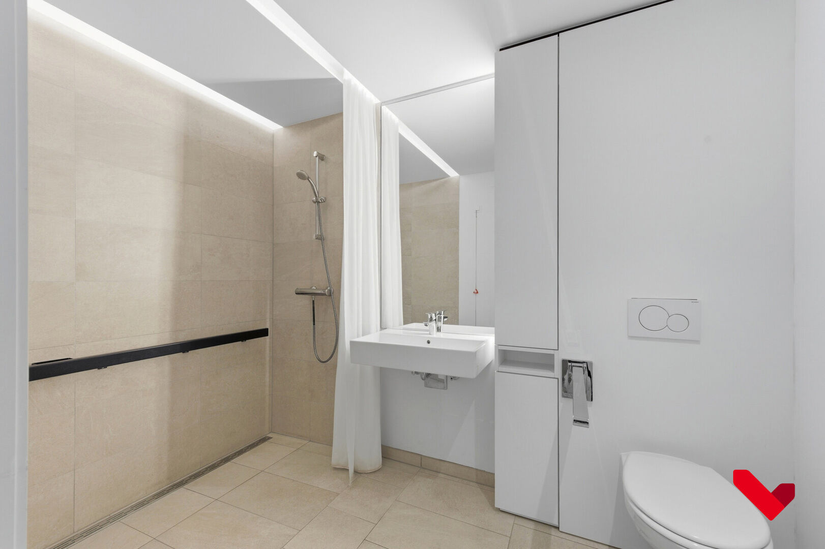L’appartement dispose en outre d’une chambre spacieuse et d’une salle de bains équipée d’une douche accessible en fauteuil roulant, de toilettes, d’un lavabo ainsi que de barres d’appui et de soutien. Enfin, vous trouverez également un espace de rangement pratique avec les raccordements pour une machine à laver et un sèche-linge.