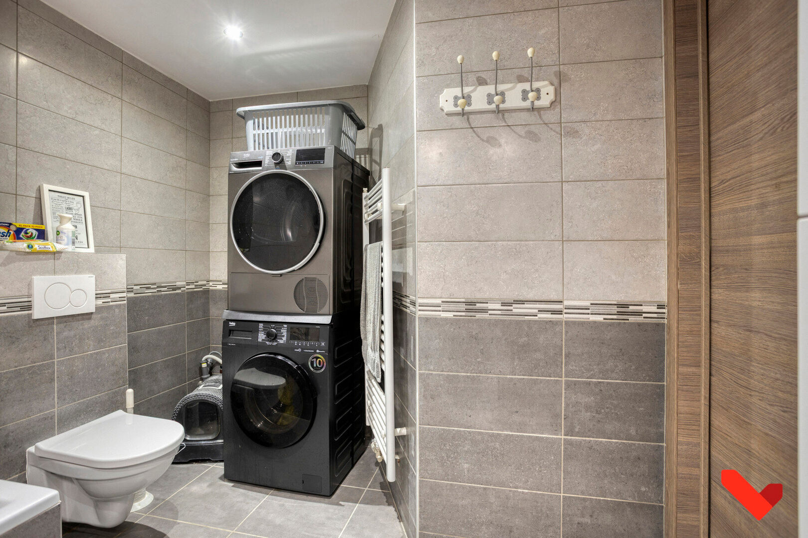 Het gelijkvloerse appartement biedt een royale leefruimte met open keuken, twee slaapkamers, een praktische dressing en een ruime badkamer met ligbad. Op de eerste verdieping bevindt zich een tweede appartement met een lichtrijke leefruimte, moderne keuken en twee goed ingedeelde slaapkamers. De badkamer en het aparte toilet sluiten logisch aan op de leefzones, wat zorgt voor een rustige en overzichtelijke woonindeling.