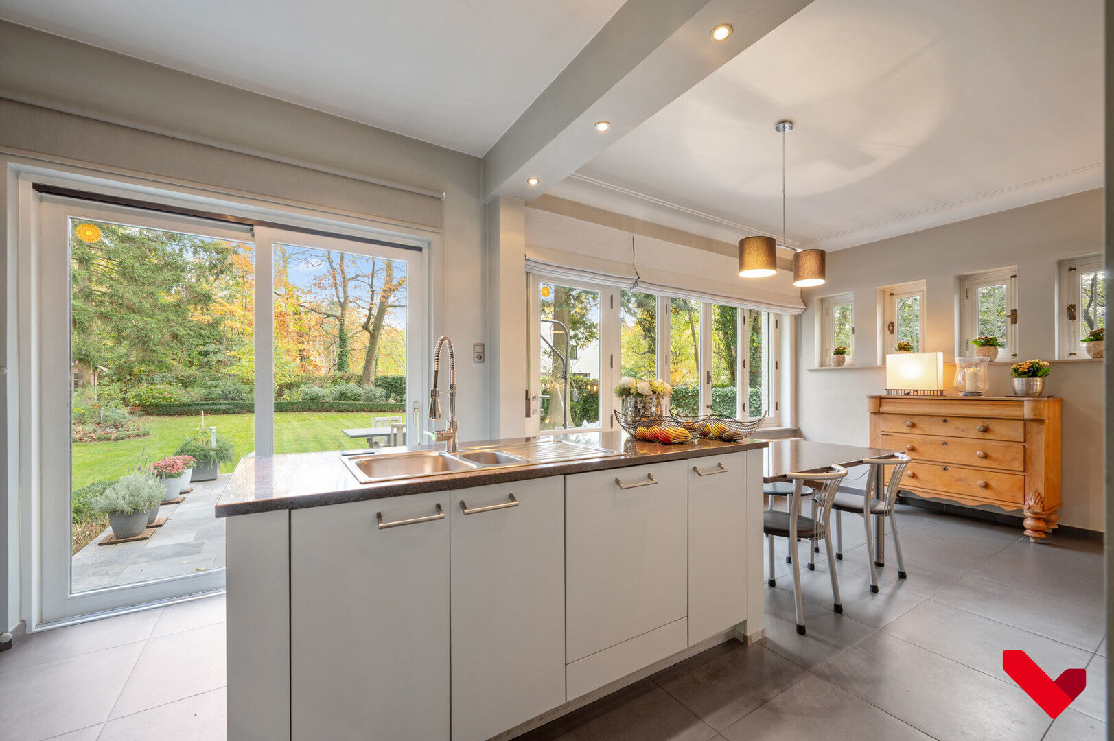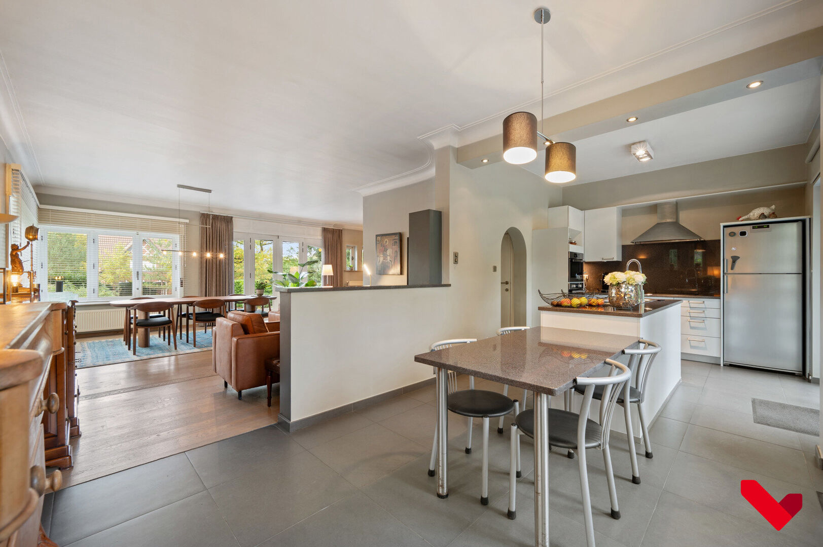De leefruimte is lichtrijk en ruim, met grote ramen die uitkijken op de verzorgde tuin. De open indeling verbindt woonkamer, eetruimte en volledig uitgeruste keuken tot één aangename leefomgeving. Het aansluitende terras vormt een natuurlijke overgang naar de tuin en nodigt uit tot buitenleven in alle seizoenen.