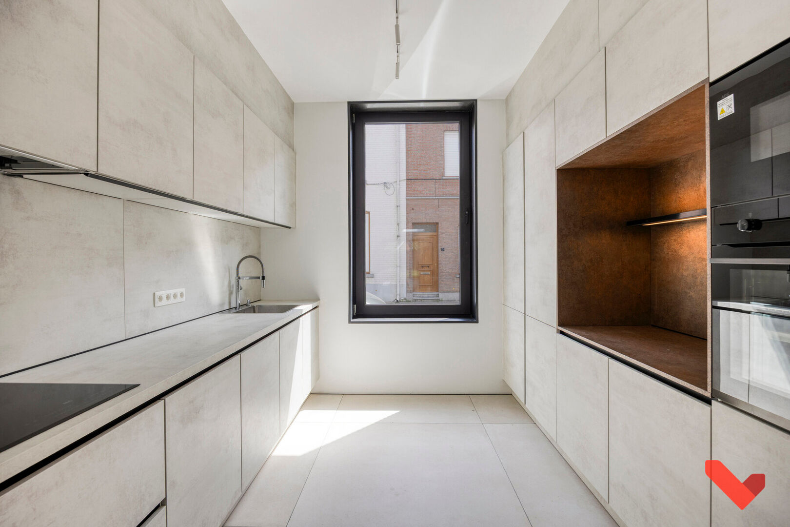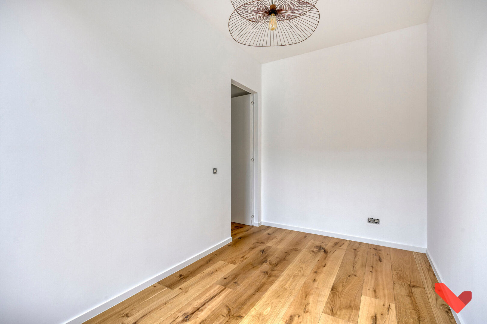 Op het gelijkvloers bevindt zich een open leefruimte met een aangename lichtinval, een gastentoilet en een volledig nieuwe, strak vormgegeven keuken met kwalitatieve toestellen en veel opbergruimte. De vloerverwarming zorgt voor een aangenaam wooncomfort, terwijl een groot schuifraam de leefruimte verbindt met het terras en de tuin.