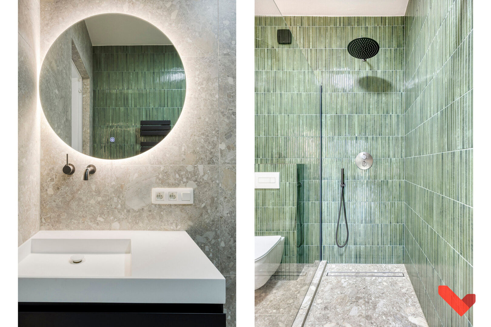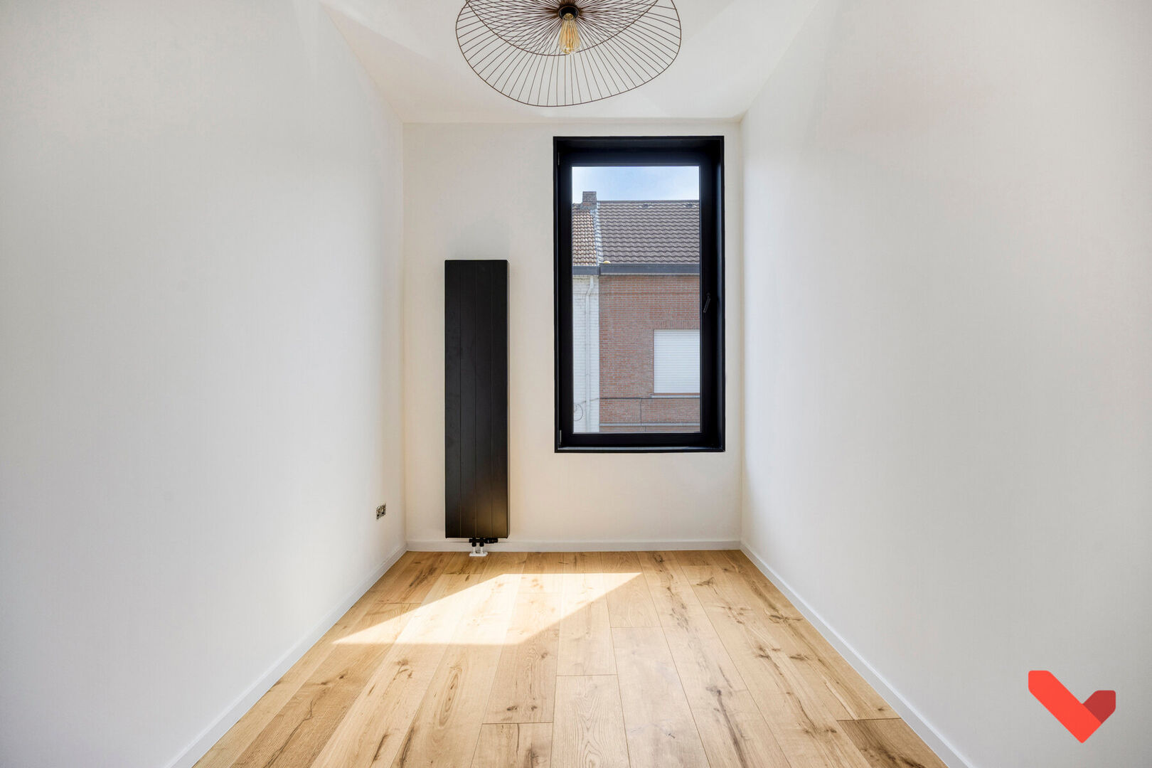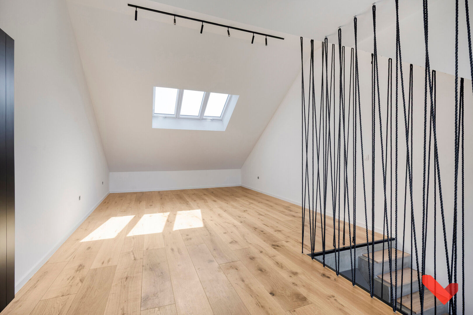 Op de eerste verdieping bevinden zich twee slaapkamers en een moderne badkamer met inloopdouche, uitgevoerd in hedendaagse materialen en stijlvolle afwerking. De zolderverdieping werd ingericht als derde slaapkamer met een grote dakkapel die zorgt voor veel licht en een aangename sfeer. De woning beschikt bovendien over een kelder, perfect voor extra bergruimte.