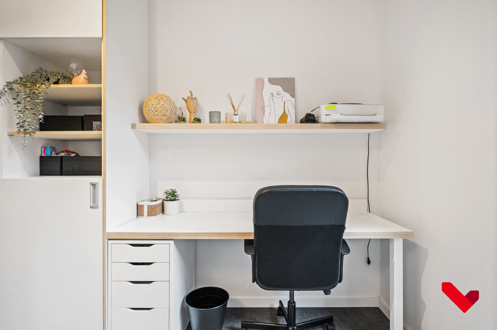 De kamer heeft een slim ingedeelde slaapvide, een knusse zithoek met uitzicht op het gedeelde terras en een volledig uitgeruste bureauruimte. Veel natuurlijk daglicht, een eigen badkamer met douche en toilet, en voldoende kastruimte maken het compleet.