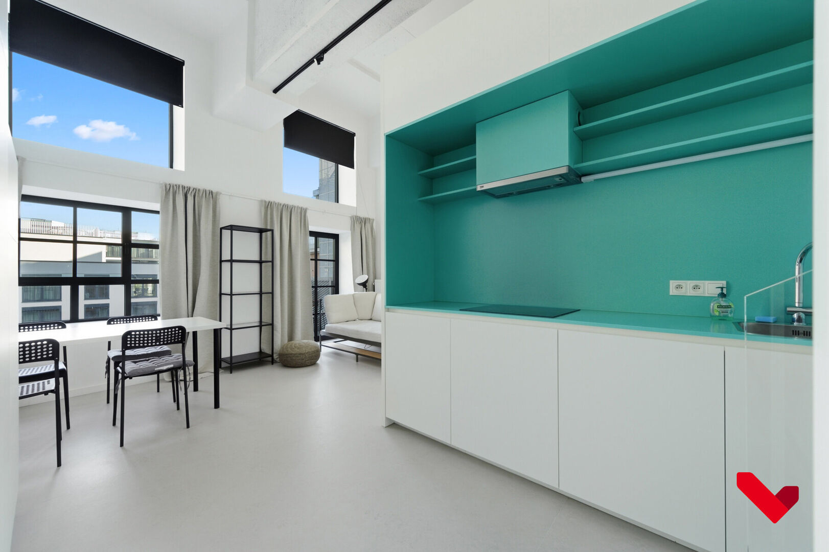 De studio wordt gekenmerkt door ongeziene plafondhoogtes tot 4,5 meter die toestaan het slaapgedeelte in de hoogte te plaatsen. In combinatie met de voorziening van een duurzaam conceptmeubel worden de ruimtes optimaal benut. De hoge plafonds zorgen daarbovenop samen met de grote ramen voor een fantastische lichtinval. De studio staat kortom voor maximale ruimteoptimalisatie, gericht op comfort, luxe en rust. Indeling: leefruimte, open geïnstalleerde keuken, slaapruimte op verdiep, badkamer met lavabo, toilet en een aansluiting voor een wasmachine.